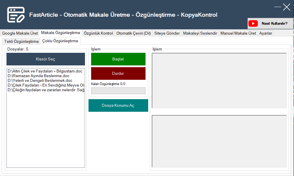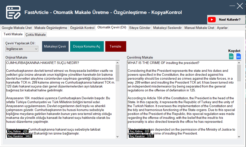 FastArticle, Otomatik makale oluşturma, makale özgünleştirme, makale dilini çevirme, makale kopyakontrol gibi birçok özelliği içerisinde barındıran gelişmiş bir makale üretme programıdır. Makale yazarları için manuel makale üretme sistemi mevcuttur, birkaç basit tıklamayla yüzlerce makaleyi özgün bir şekilde oluşturabilirsiniz